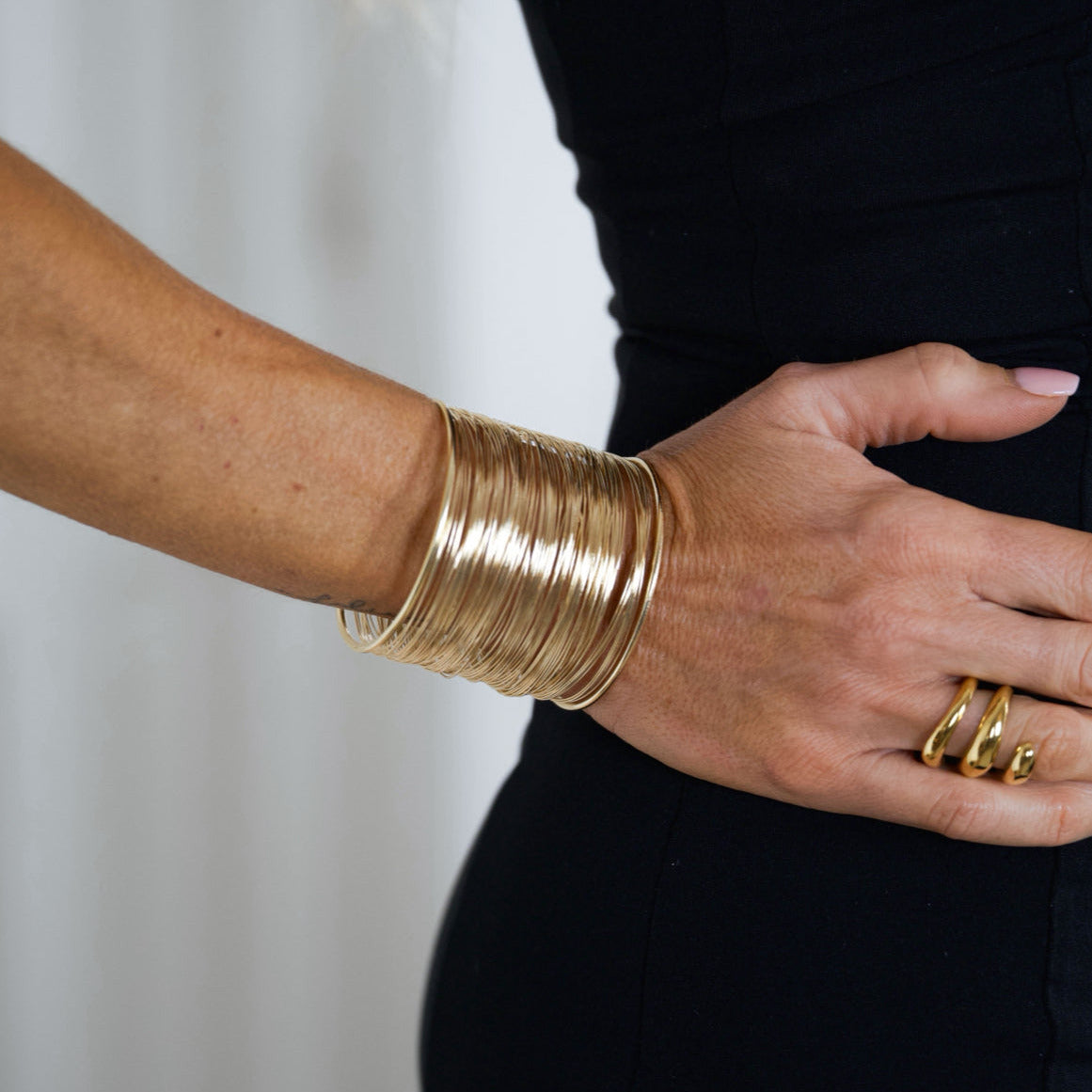 Prachtige brede statement armband met verschillende kleine fijne draadjes.
