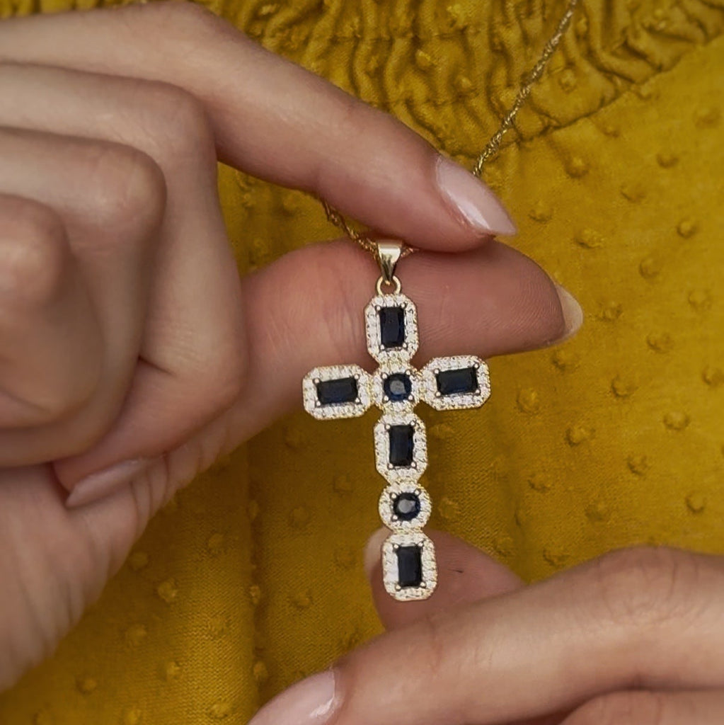 Statement ketting met een kruis met blauwe en witte zirconia steentjes.