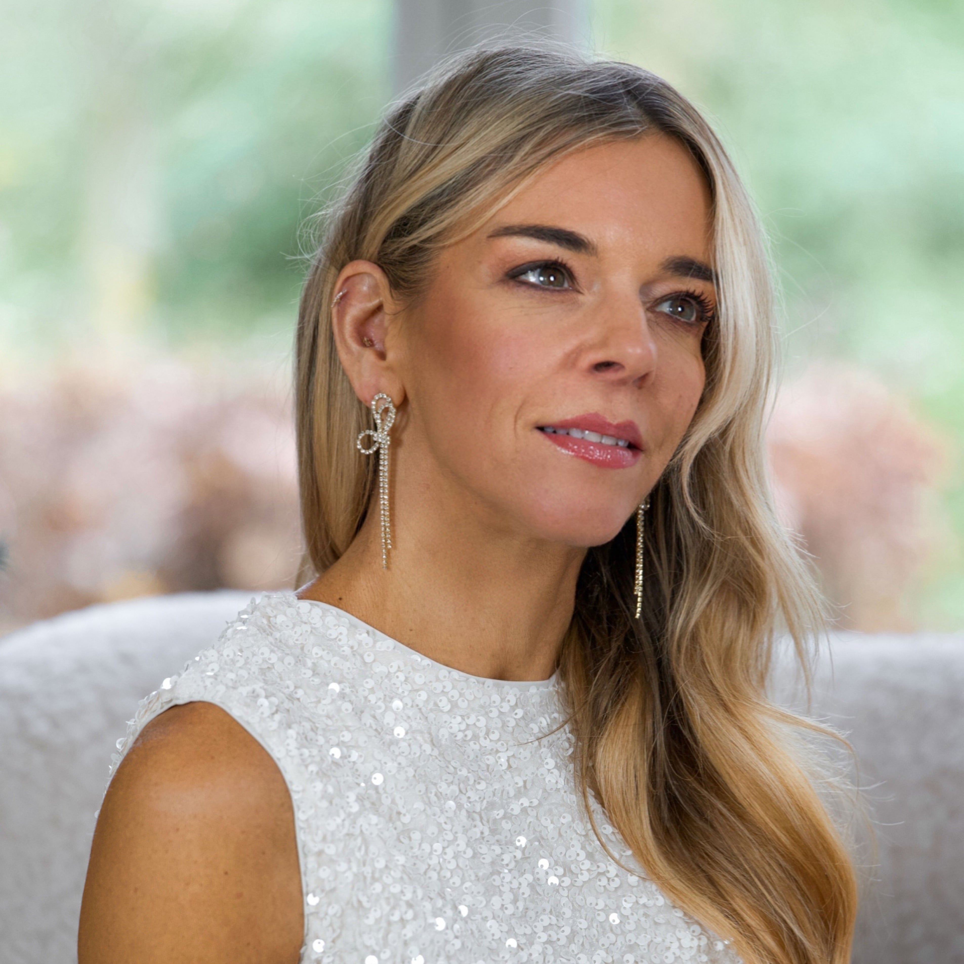 Schitterende statement oorbellen in goud met witte strass steentjes met bovenaan een schuin dubbel strikje.