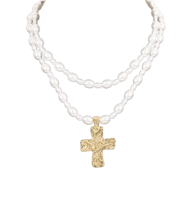 Elegante streetwear glam, bestaat uit 2 losse kettingen met imitatieparels. 1 ketting zonder kruis en 1 met kruis.