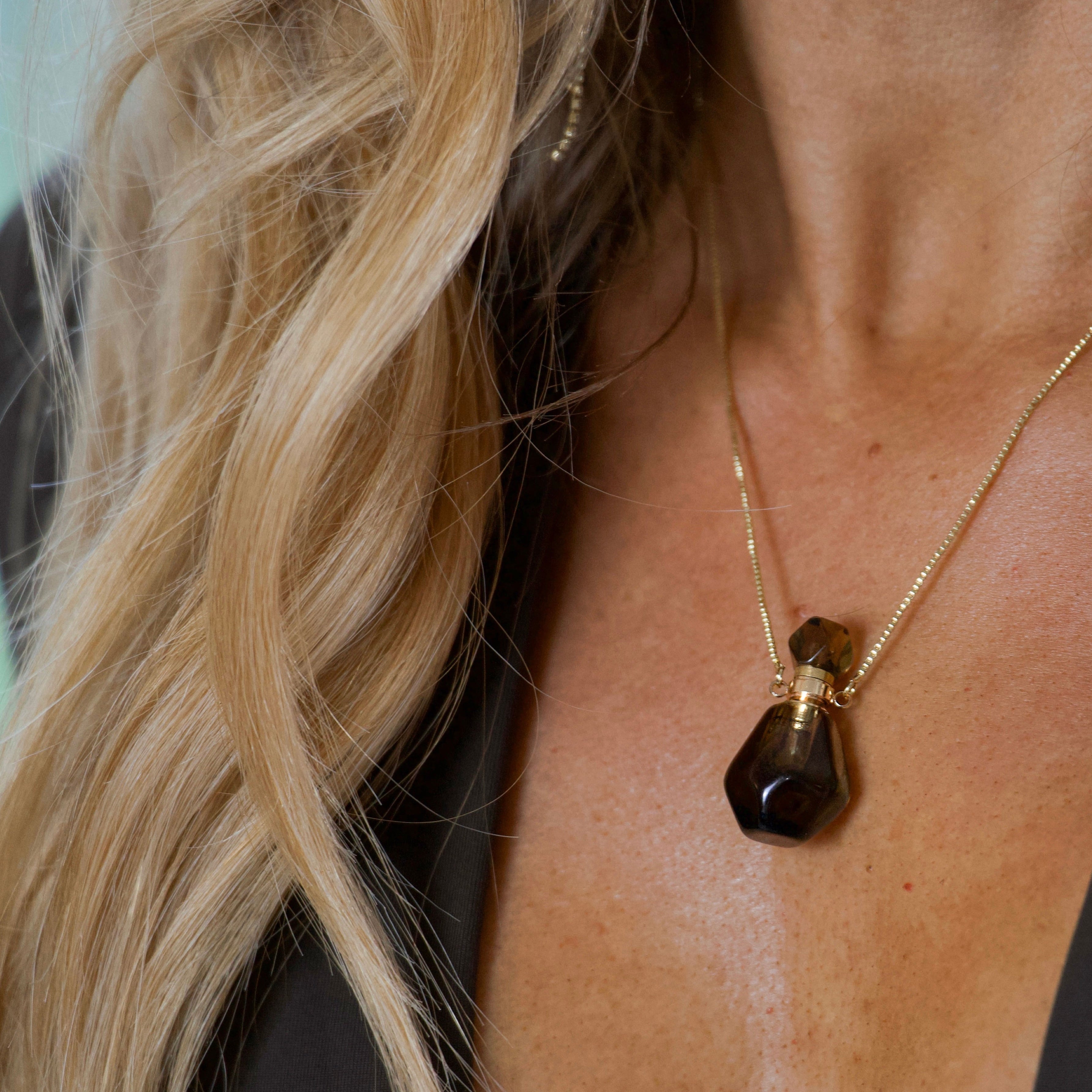Nostalgische ketting met een flesje in natuursteen (steen is Aventurine in Tea brown) aan, leuk om je outfit helemaal te stylen.