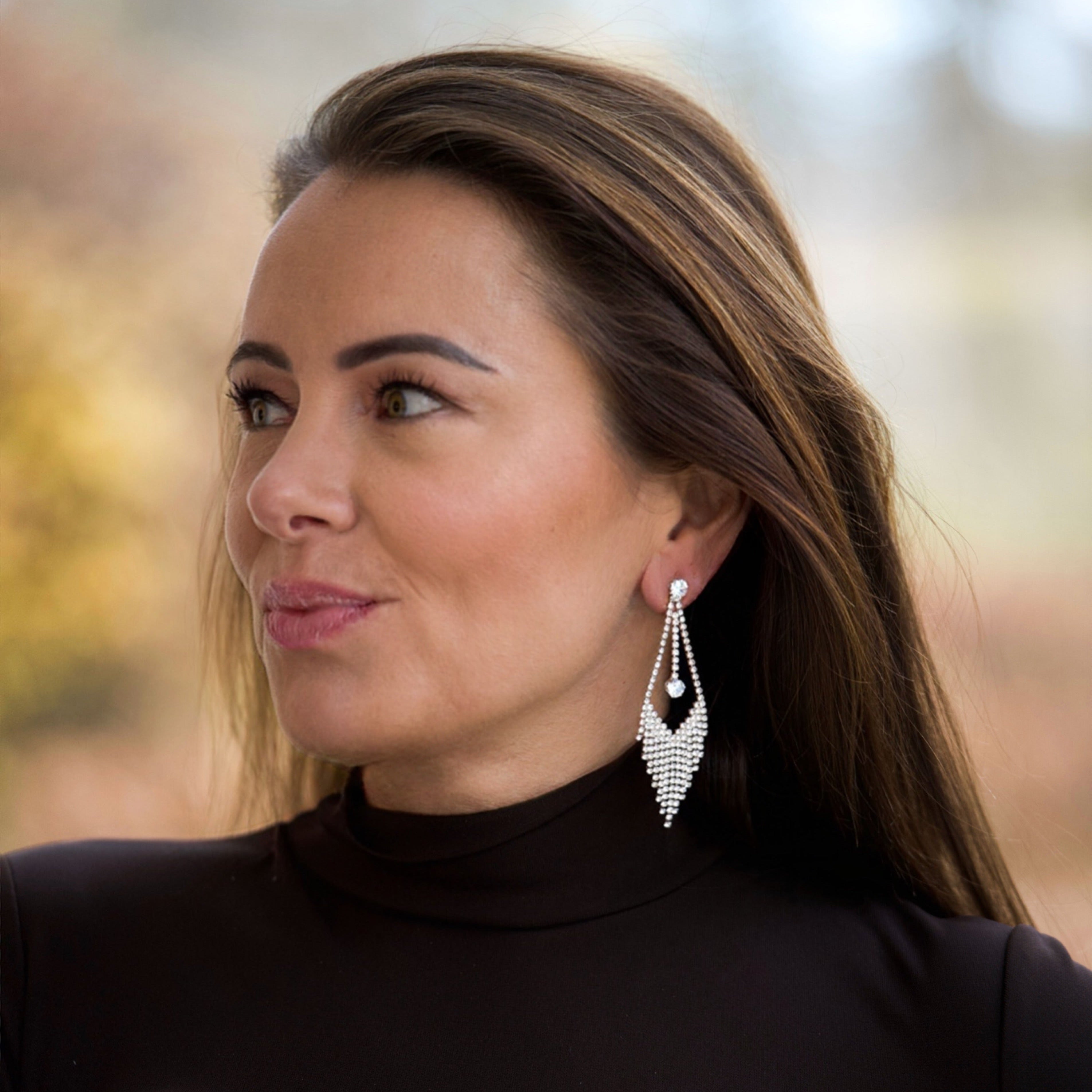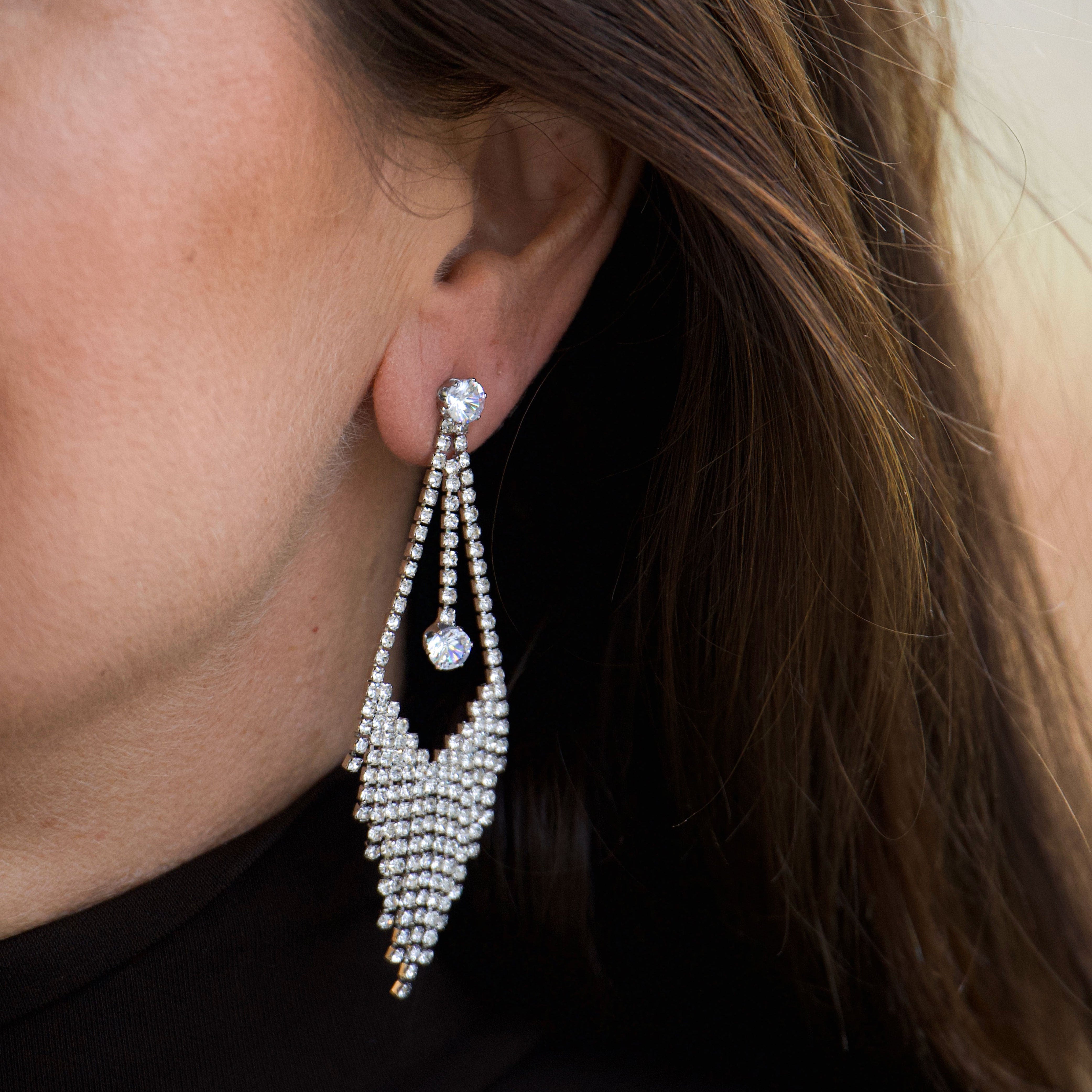 Schitterende statement oorbellen in zilver met witte strass steentjes.